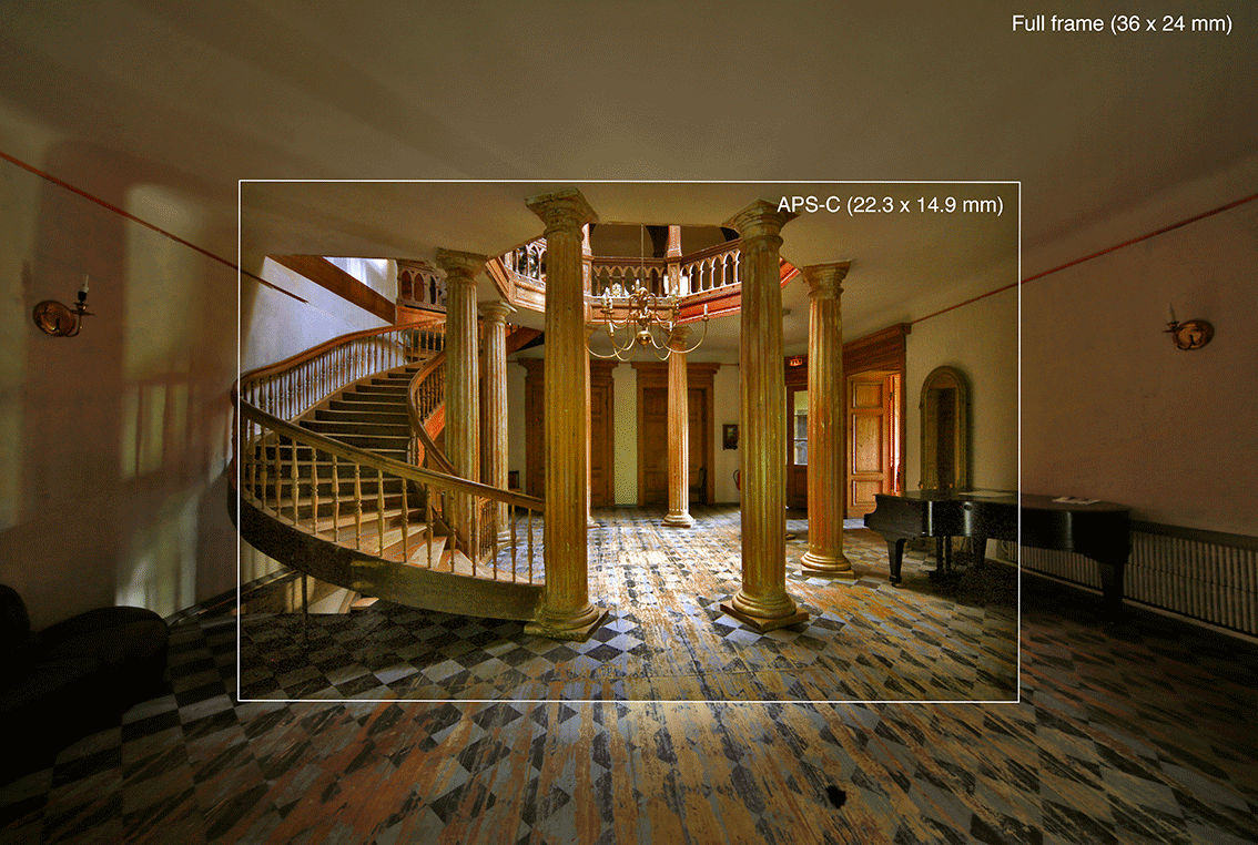 Full frame (36×24) un APS-C (22.3×14.9) matricu sensoru salīdzinājums